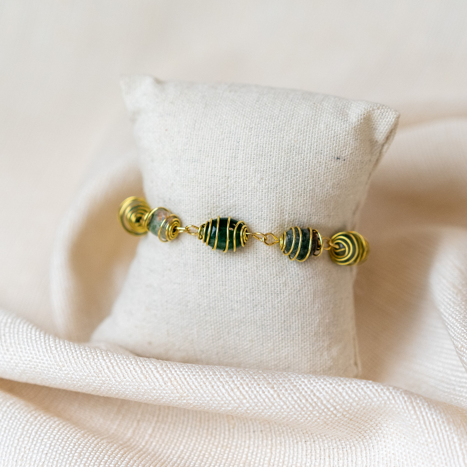 Gemstone beads of at least 8mm, we used the Moss Agate