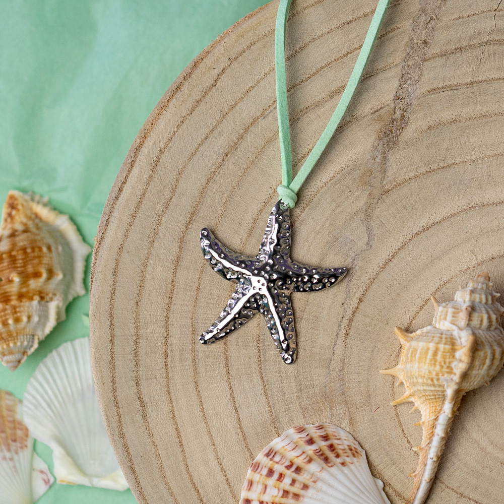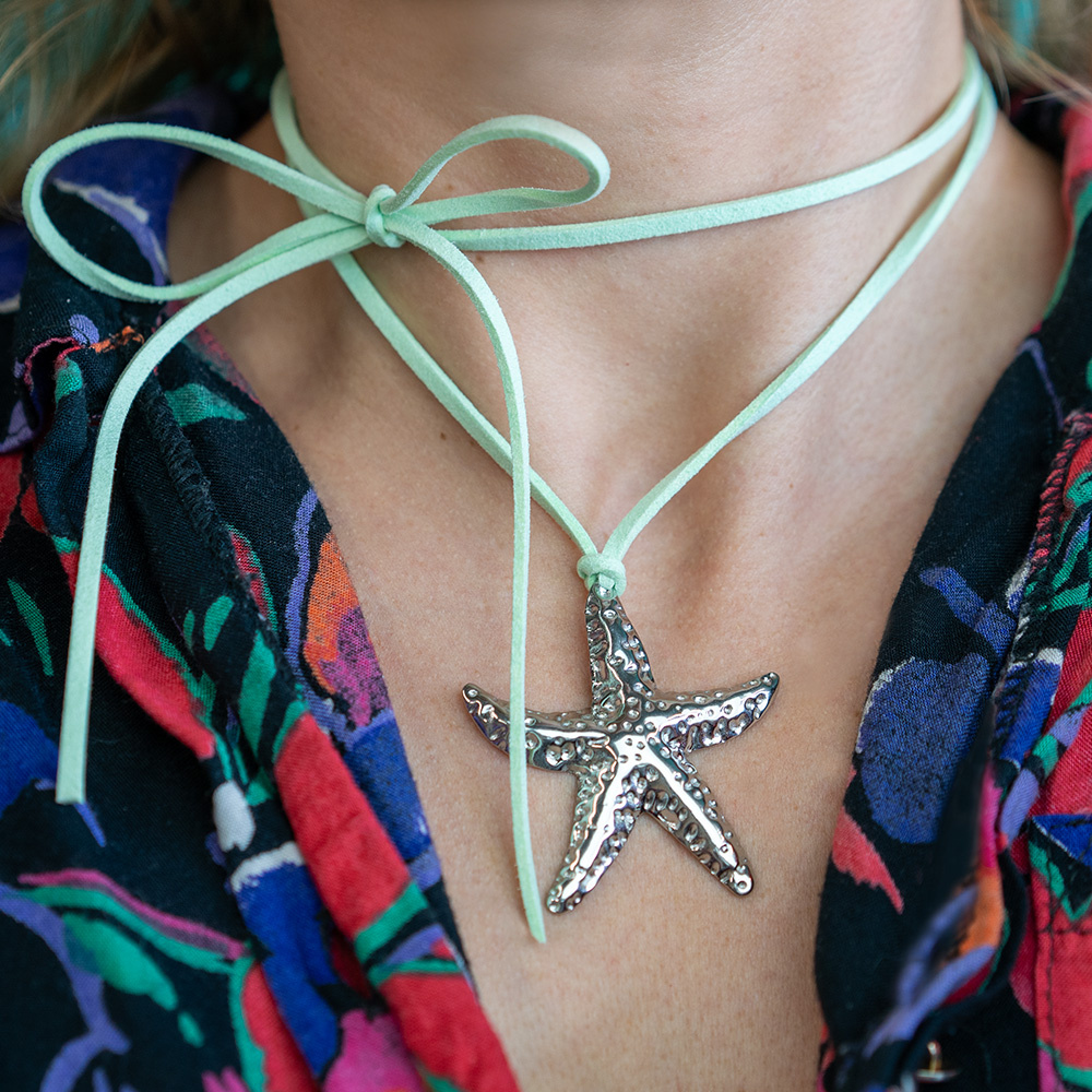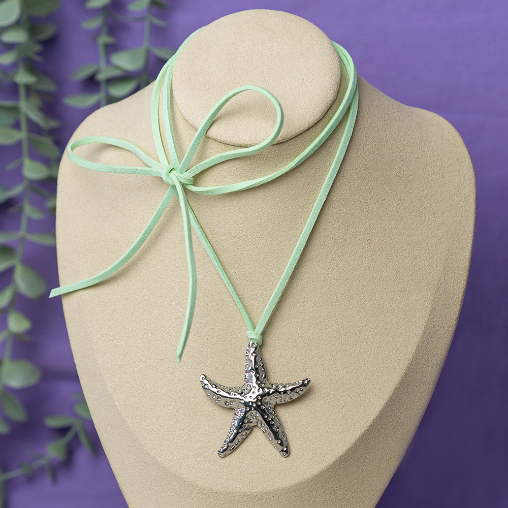 Cut off about 120cm of suede cord and cut the end at an angle. Now thread the starfish onto the cord and make sure it hangs in the middle. Make a knot above the charm, tying the thread around itself.