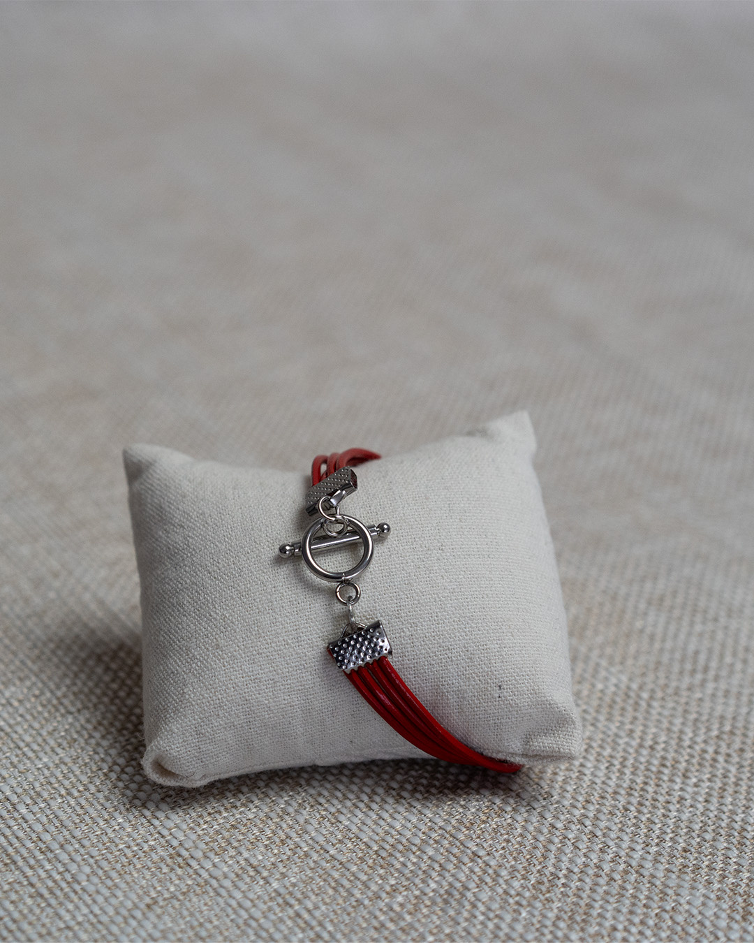 - You are only going to finish the bracelet. Measure how long you want the bracelet to be (you can measure it around the wrist or calculate it by using a size chart) Attach the ribbon end to the ends by placing the 4 strands of blue leather next to each other in the ribbon end and pinching the clasp closed with your flat nose pliers. To make it firm you can first put a little glue in the ribbon end.