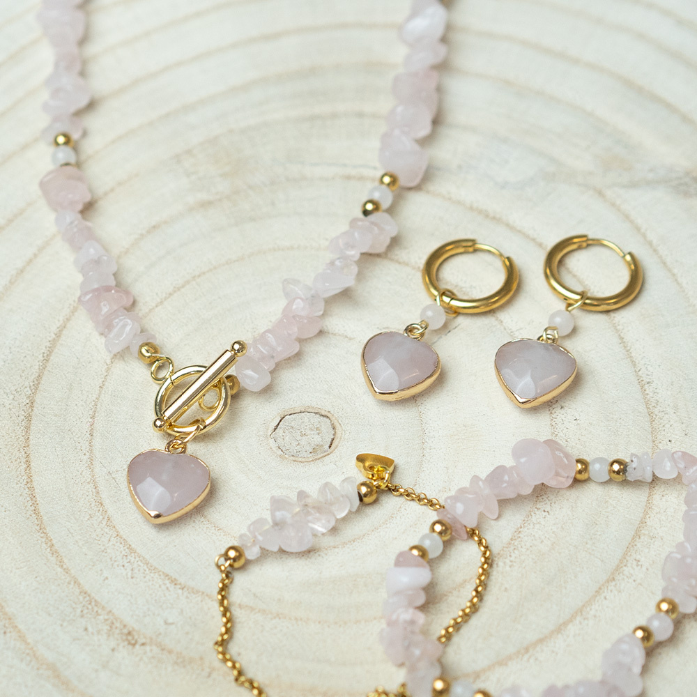 Rose Quartz is the stone of love, the heart charms fit perfectly with this gemstone. That's why they appear several times in this loving set.