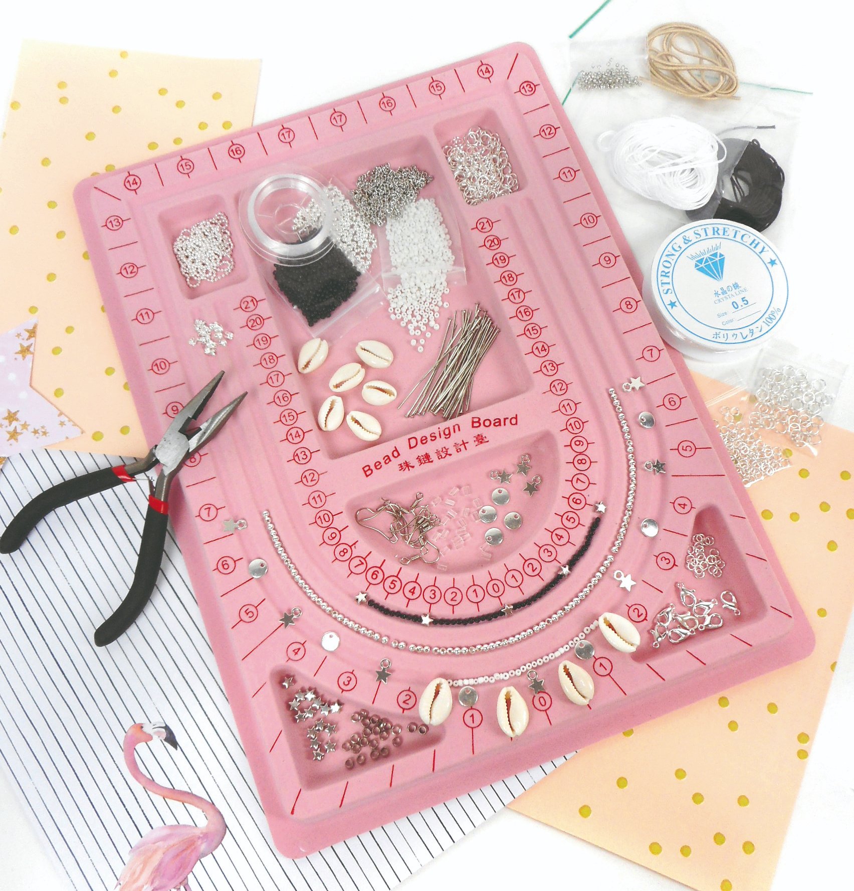 Want to start making jewelry? Our complete kit includes all the basics, cords and pliers to get started and extra beads, charms and kauri shells to make your own designs. Combine with your favorite colours and start making jewelry.
